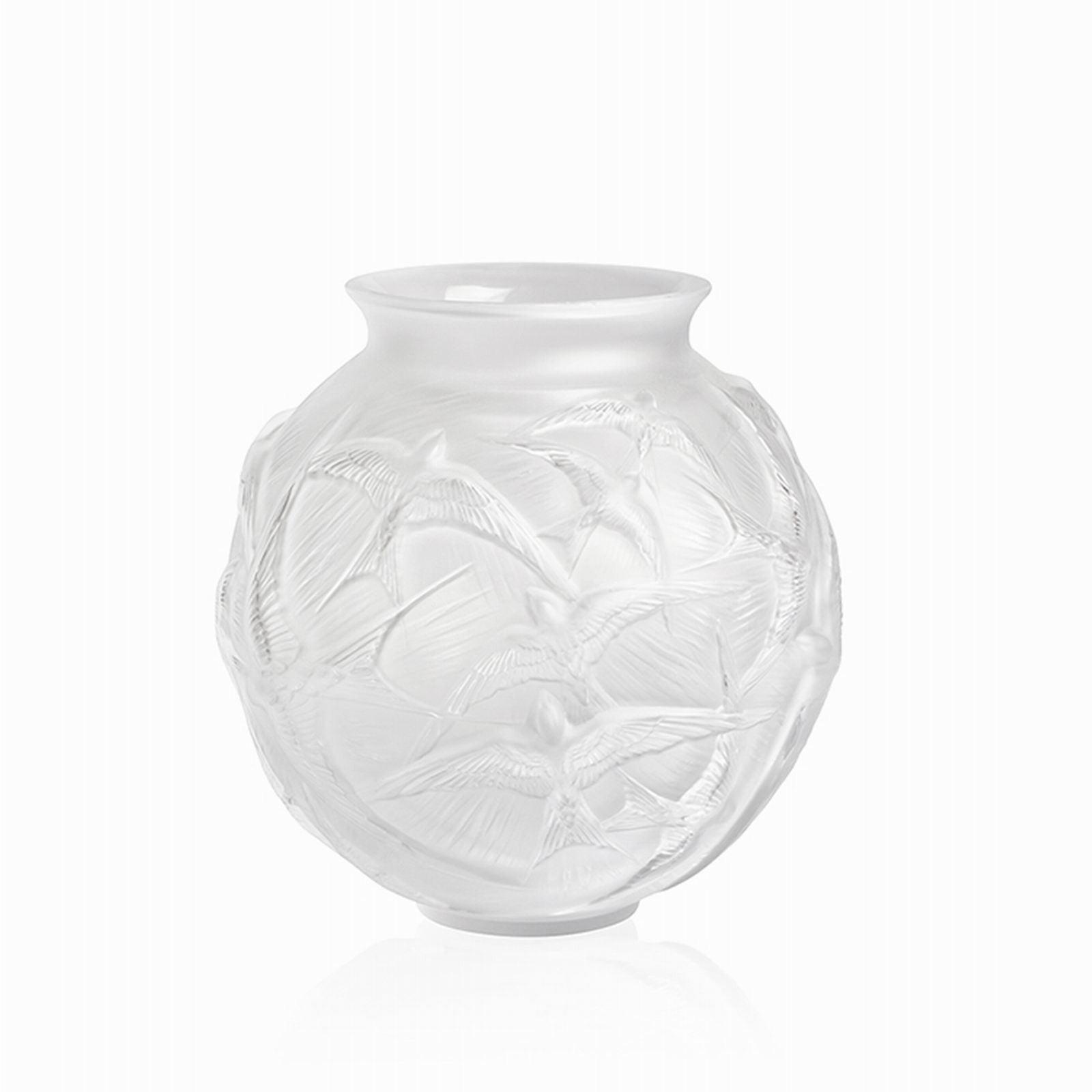 Realizzate in cristallo satinato e rilucidato, emblematico di Lalique, le rondini sono giustapposte in un gioco grafico sulla ripetizione.