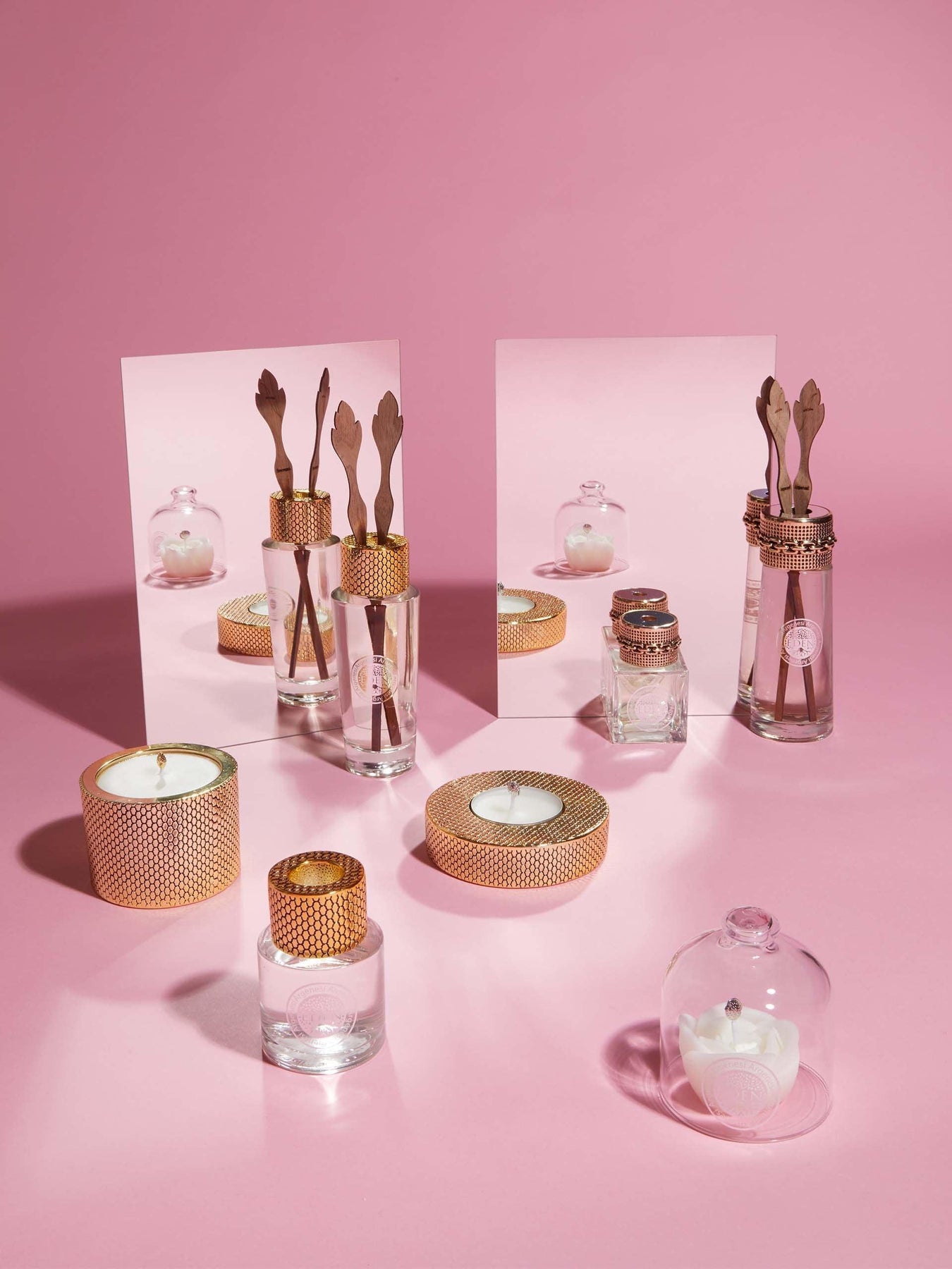 GIARDINI DELL’EDEN di Argenesi. Questo profumatore per ambiente è composto da un contenitore in vetro trasparente dalla capienza di 100ml ed un collare in resina che viene ricoperto in Oro 24Kt, risultando lucido al tatto ed alla vista. In trasparenza si nota il colore tenue della profumazione Bianco Perla contenuta al suo interno.