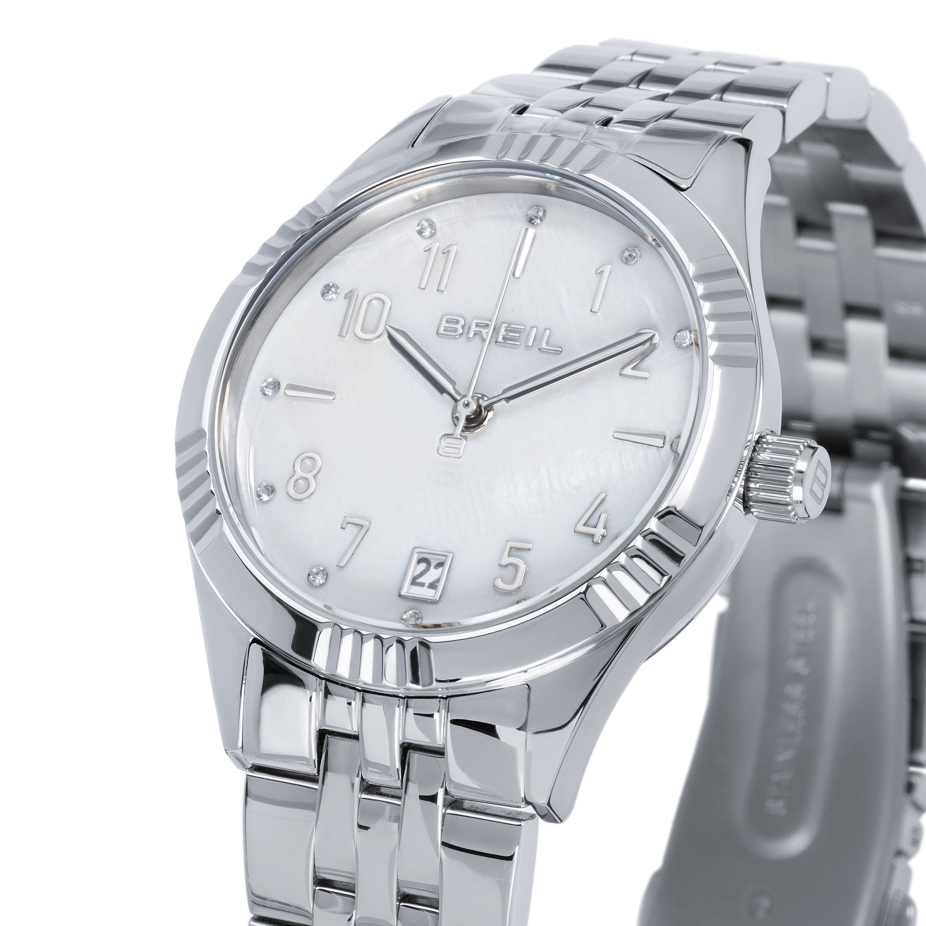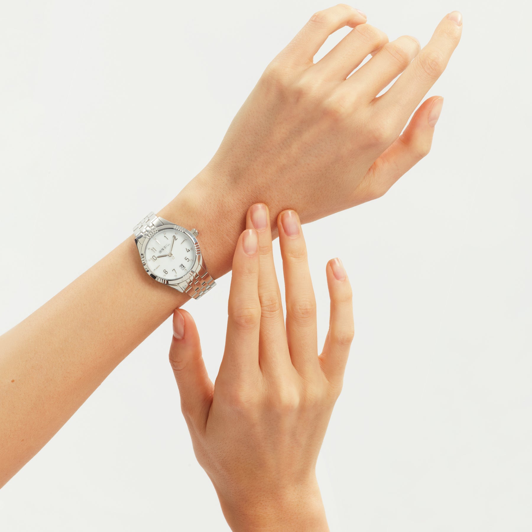 Il cronografo da donna Stand Out è un incredibile mix di sportività e glam. Il risultato è un orologio dal carattere decisamente forte. L'acciaio lucido, di cassa e bracciale, si sposa alla perfezione con il quadrante in madre perla, arricchito dai numeri arabi per un’immediata lettura dell’ora.