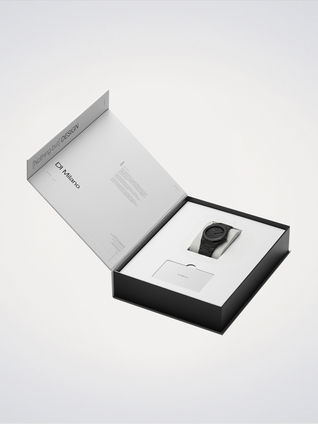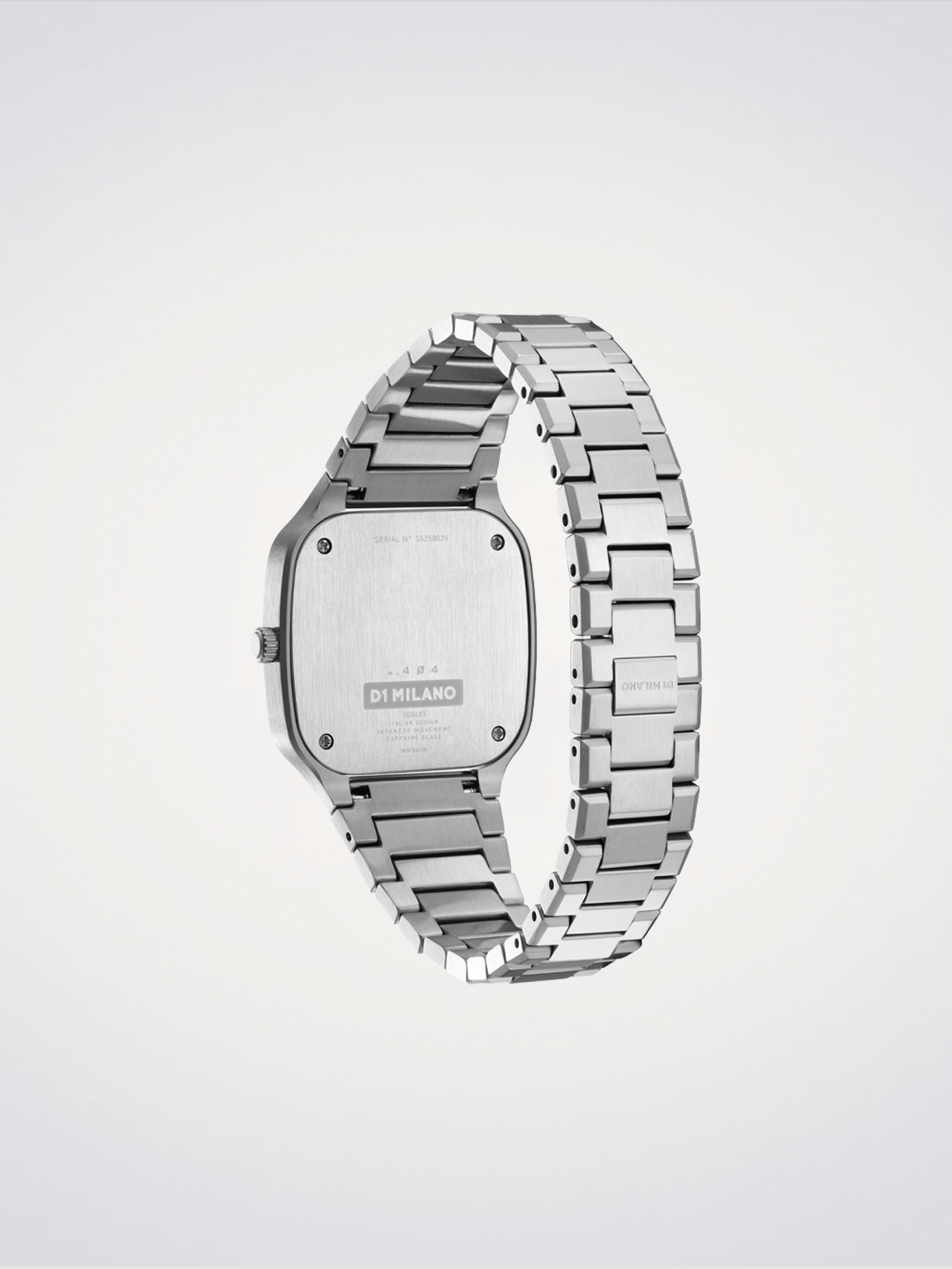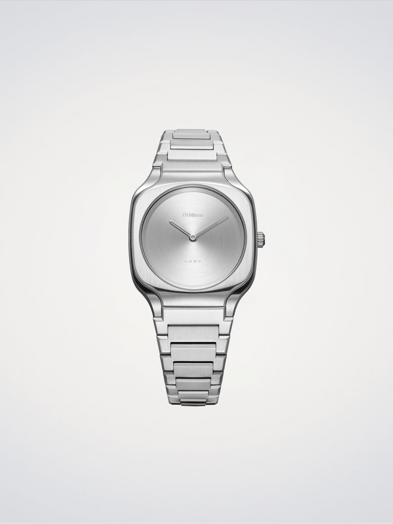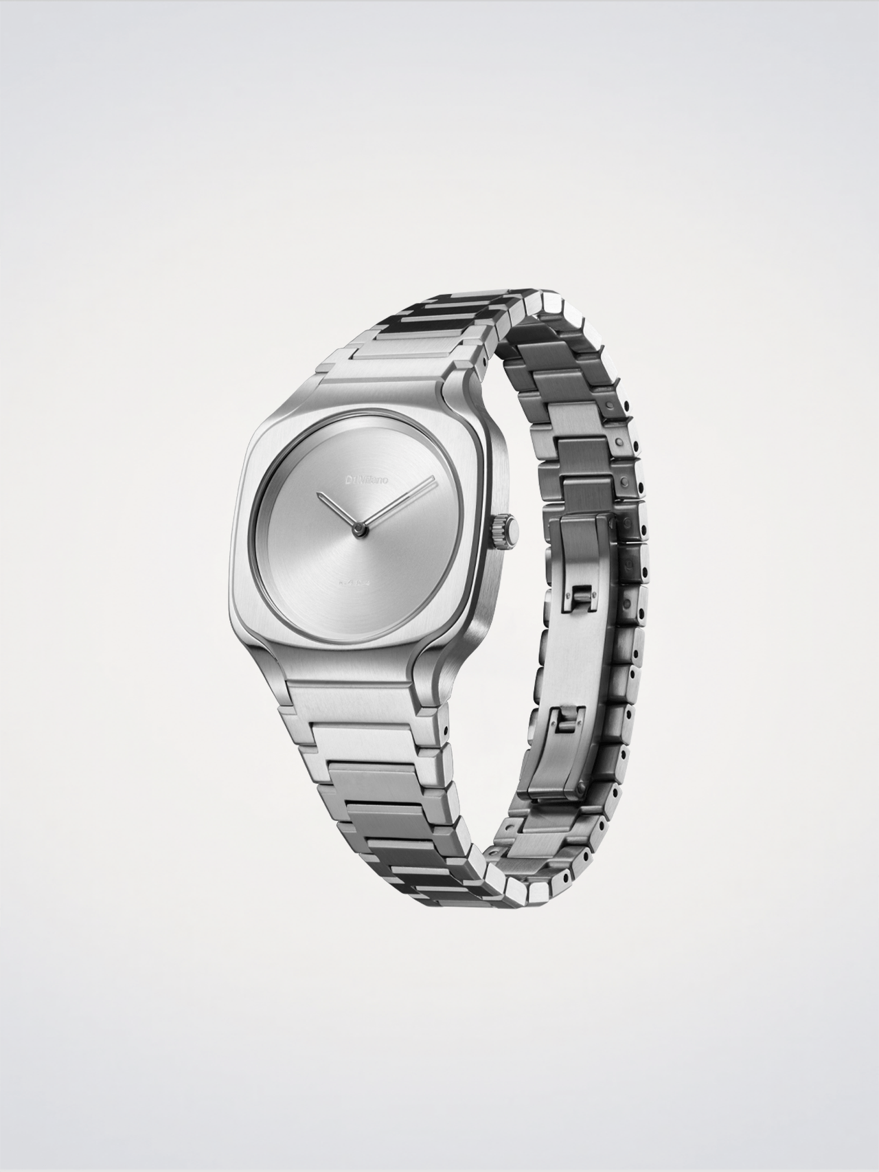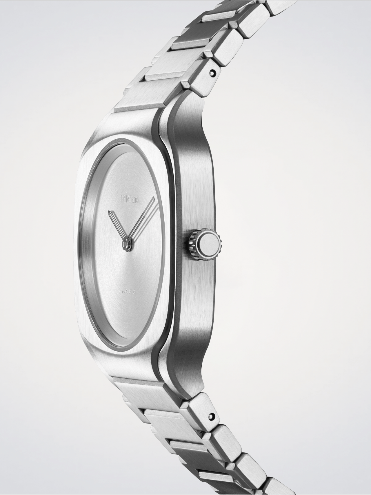 Una nuovissima dimensione della cassa di 32 mm per il nostro quadrato. Un design monocromatico in argento, così pulito che rende l'orologio in grado di riflettere tutta la luce che lo colpisce.