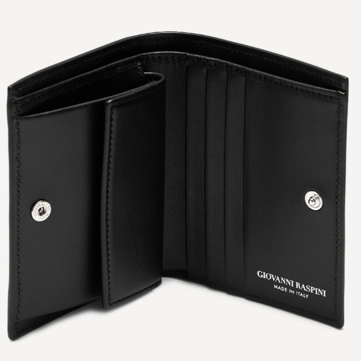 Per il suo debutto nel mondo della pelletteria, Giovanni Raspini sceglie il colore nero, da sempre cromia distintiva del brand, accostandolo a pellami riconosciuti per la loro qualità: la pregiata Pelle Liscia Pienza Pieno Fiore e la Pelle Goffrata.