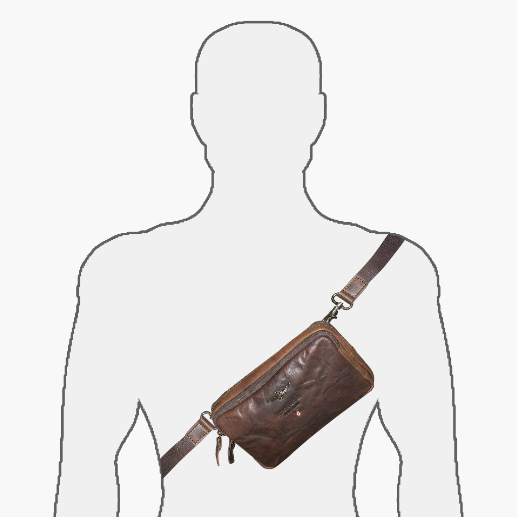 Tracolla piccola in vera pelle, interno in poliestere con trama a righe verticali e accessori color canna di fucile.