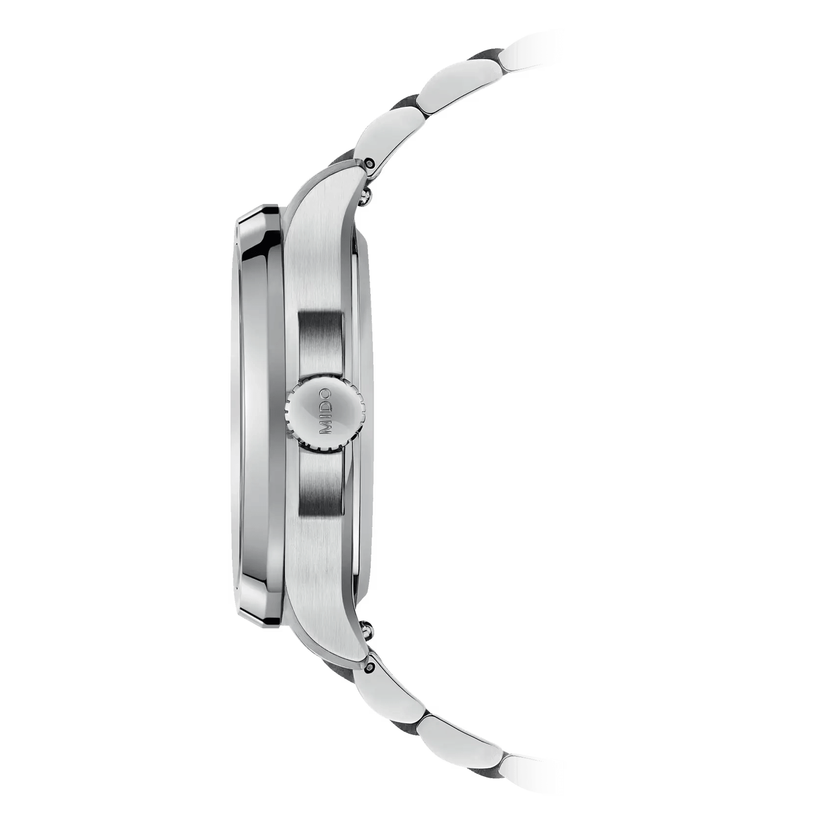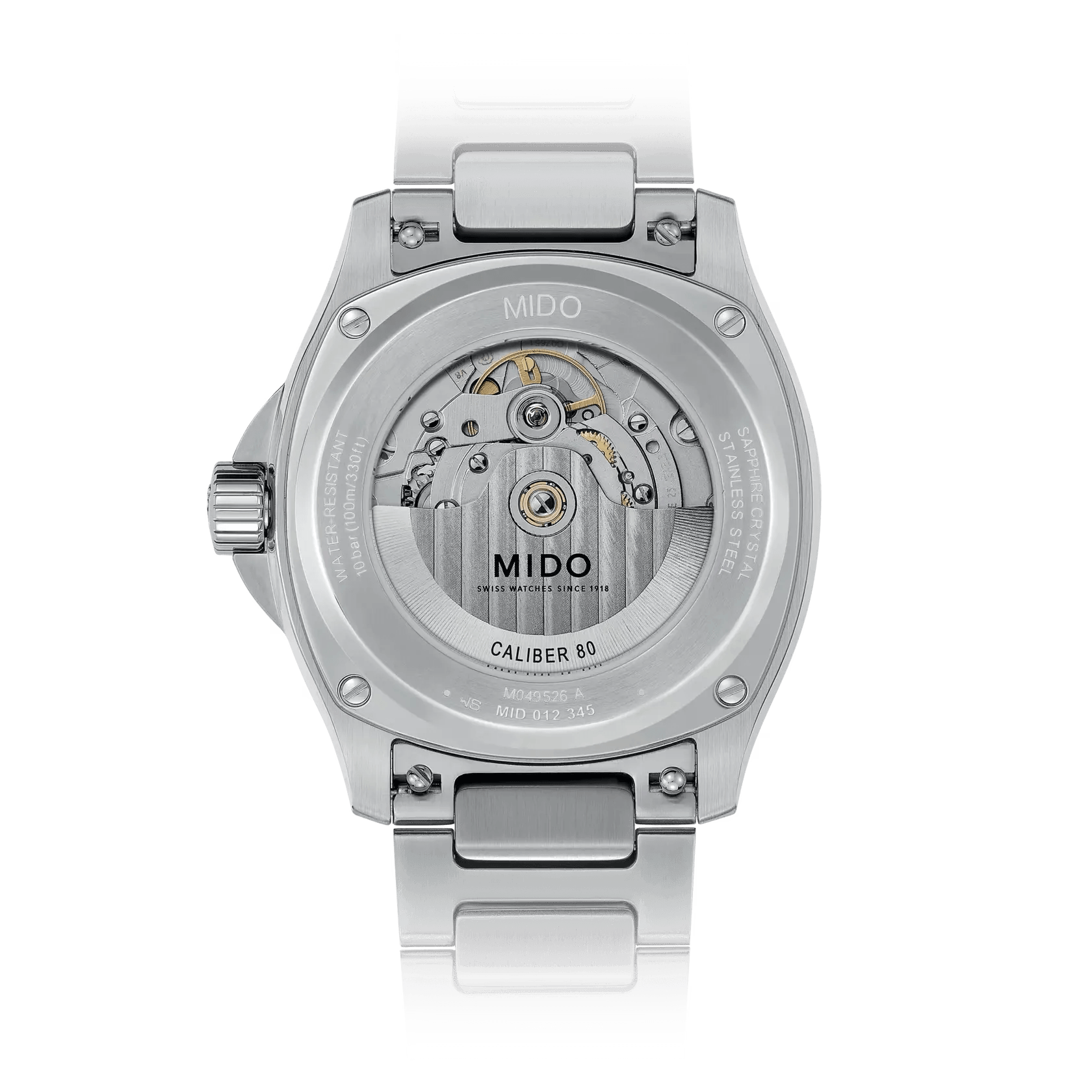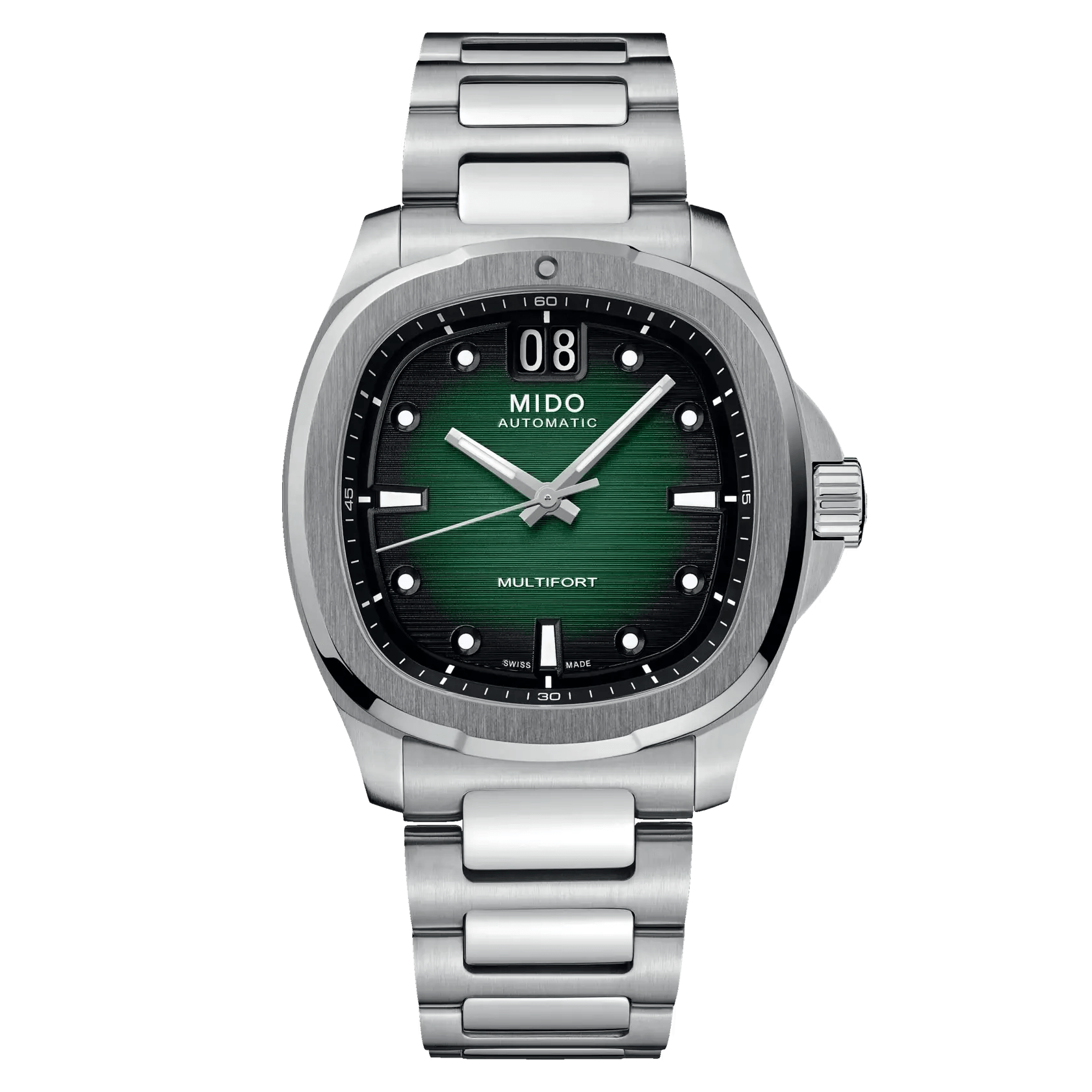 L'orologio Mido Multifort Big Date da 40 mm con cassa in acciaio verde e movimento automatico di alta qualità offre una garanzia di 2 anni e resistenza all'acqua fino a 10 bar (100 m / 330 ft). Con un peso di soli 155 g, è leggero e sottile e può essere indossato ogni giorno.