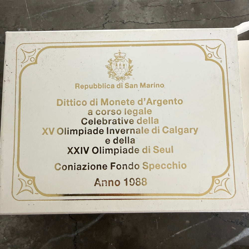 Dittico numismatico della Repubblica di San Marino del 1988, composto da due monete d'argento a corso legale. Questa collezione commemorativa celebra simultaneamente la XV Olimpiade Invernale di Calgary e la XXIV Olimpiade estiva di Seul, eventi sportivi di rilevanza mondiale. Realizzate in coniazione Fondo Specchio, le monete presentano una qualità di finitura superiore con campi specchiati e rilievi satinati. Un'importante testimonianza numismatica degli Giochi Olimpici del 1988, ideale per collezionisti di monete commemorative e appassionati di storia olimpica.