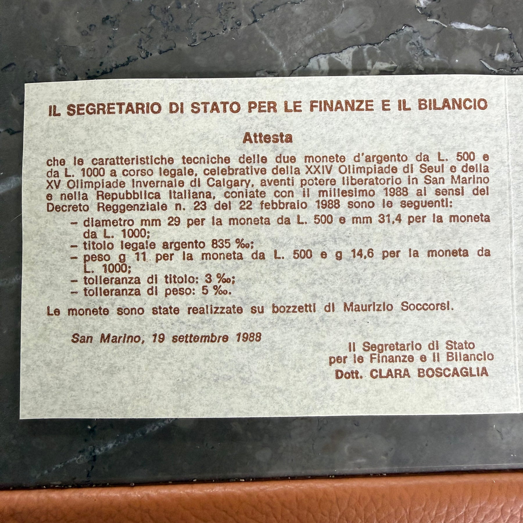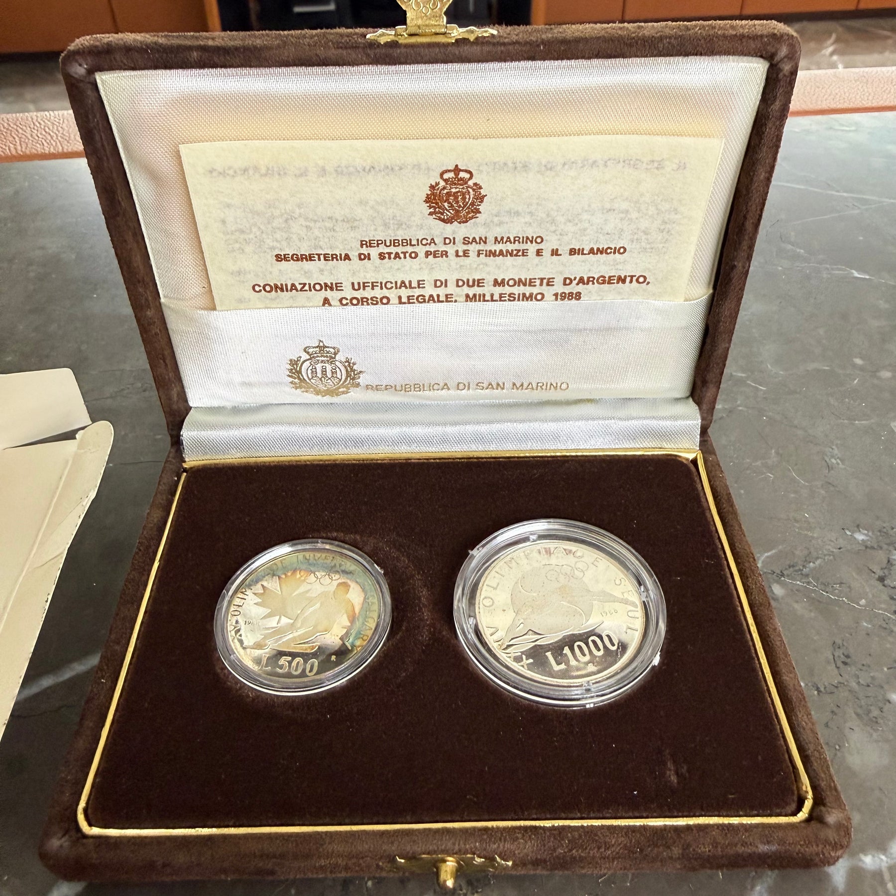 Set di due monete commemorative in argento 835‰ della Repubblica di San Marino, coniate nel 1988 con corso legale in San Marino e Italia. La moneta da 500 lire presenta diametro di 29 mm e peso di 11 grammi, mentre quella da 1000 lire misura 31,4 mm di diametro per 14,6 grammi. Entrambe celebrano la XV Olimpiade Invernale di Calgary e la XXIV Olimpiade di Seul, realizzate su bozzetti dell'artista Maurizio Soccorsi secondo il Decreto Reggenziale n. 23 del 1988. Pezzi numismatici autentici con certificazione ufficiale dello Stato, perfetti per collezionisti di monete olimpiche e storiche.