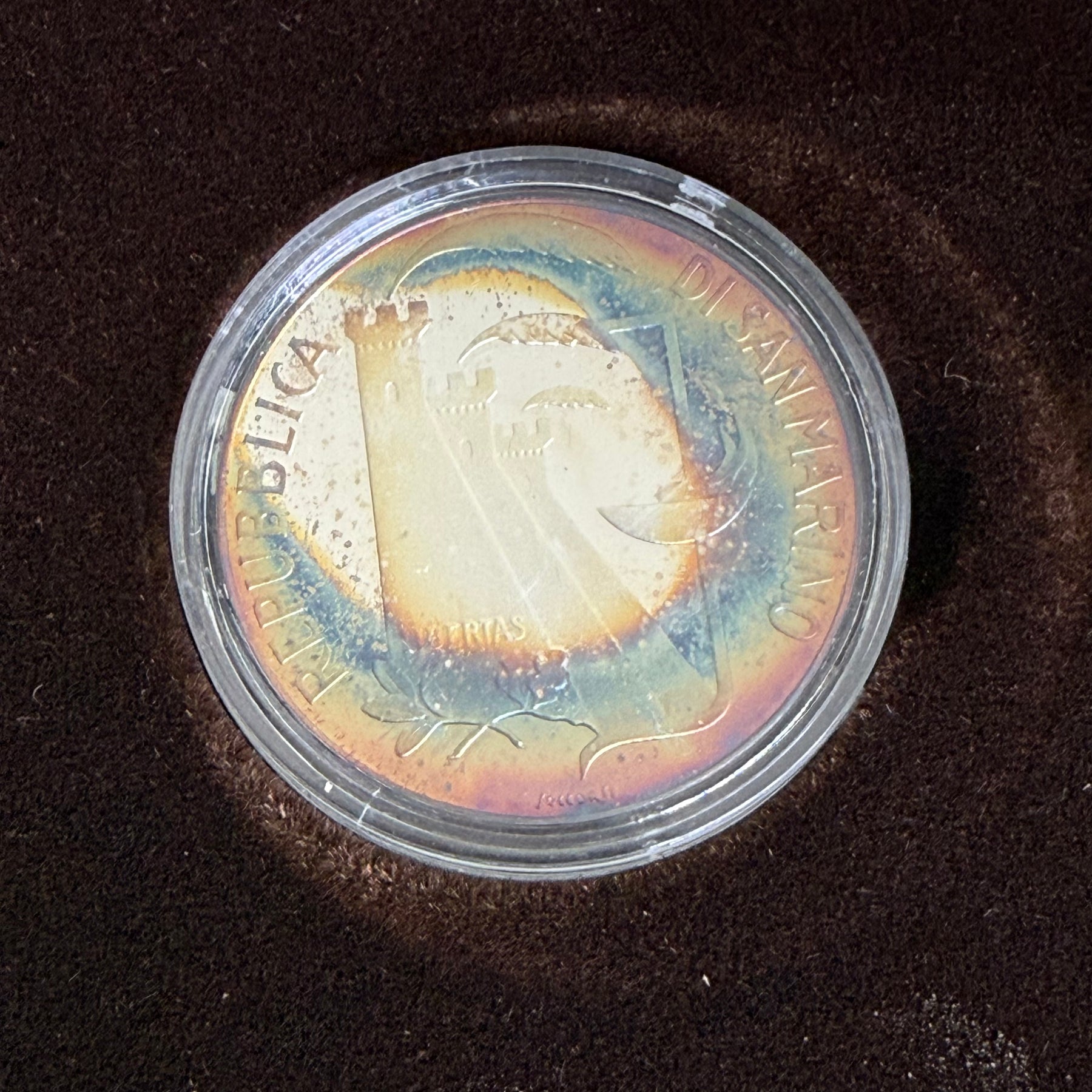 Recto dell'Intera monetazione: | Tre Montl, simbolo tradizionale della Repubblica di San Marino, sormontati dalle torri e dalle penne, sono rappresentati in un ardito scorcio, accanto ad essi figura Il tripode olimpico e alla loro base si trova il motto « LIBERTAS ». al di sotto scaturiscono i due traici di quercia e di alloro che tradizionalmente si accompagnano allo stemma ufficiale della Repubblica. Circonda Il tutto la legenda & REPUBBLICA DI SAN MARINO».