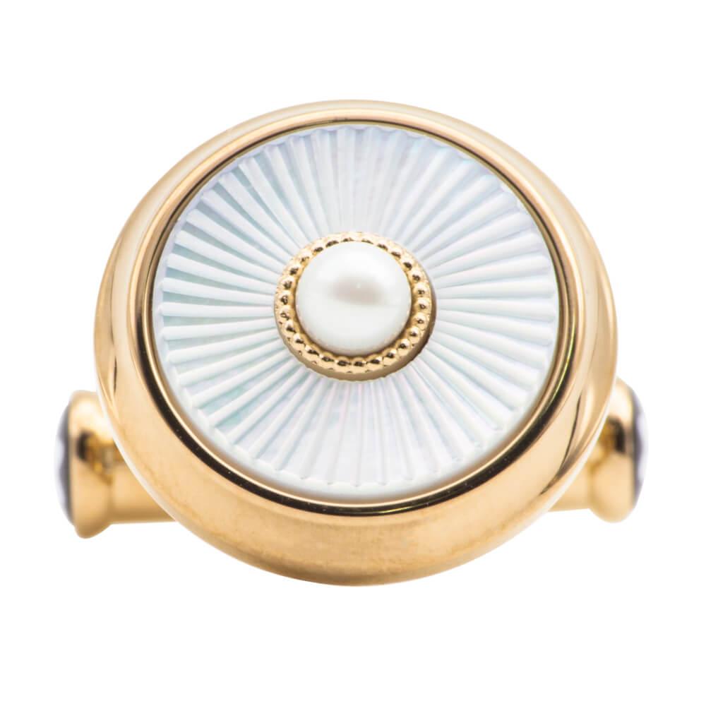 I gemelli sono realizzati in acciaio inossidabile con rivestimento in PVD color oro. Gli intarsi sono realizzati in madreperla con motivo guilloché.
