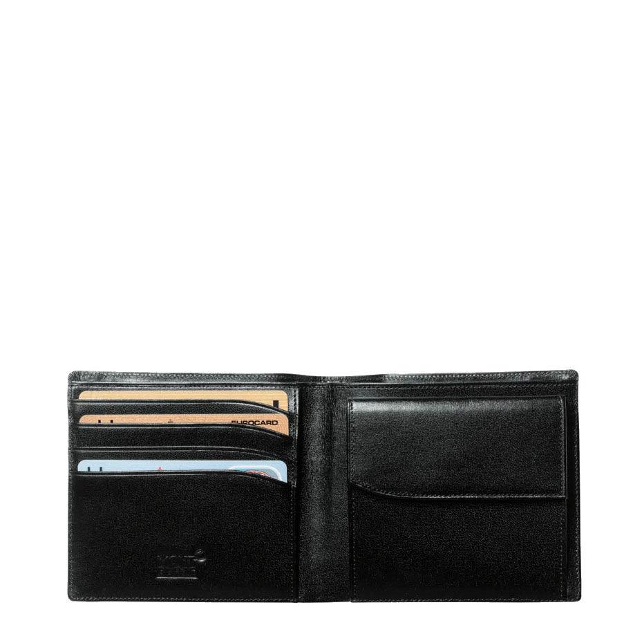 Portafoglio 4 scomparti, in pelle di vitello pieno fiore di provenienza europea, esclusivo effetto lucido Montblanc, fodera jacquard con marchio Montblanc, emblema Montblanc con anello finitura palladio, 4 tasche per carte di credito, 2 scomparti per banconote, portamonete con patta