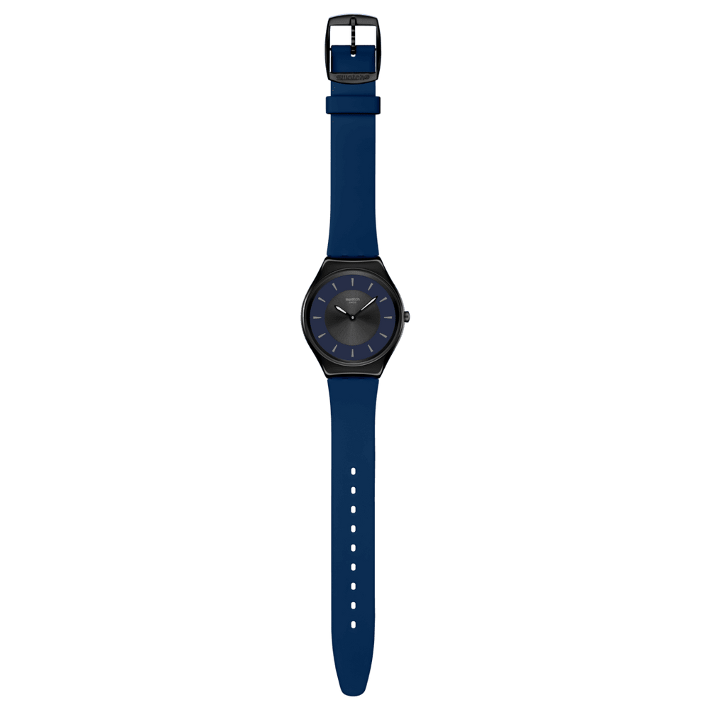 Questo orologio ultrapiatto presenta un quadrante nero con finitura spazzolata soleil, un anello esterno stampato in blu scuro, indici stampati in grigio e lancette di ore e minuti nere che si illuminano al buio. La cassa e la fibbia in acciaio inossidabile lucido hanno un rivestimento in PVD nero e sono completate da un cinturino blu scuro opaco con una parte inferiore grigio opaco e un passante blu scuro opaco.