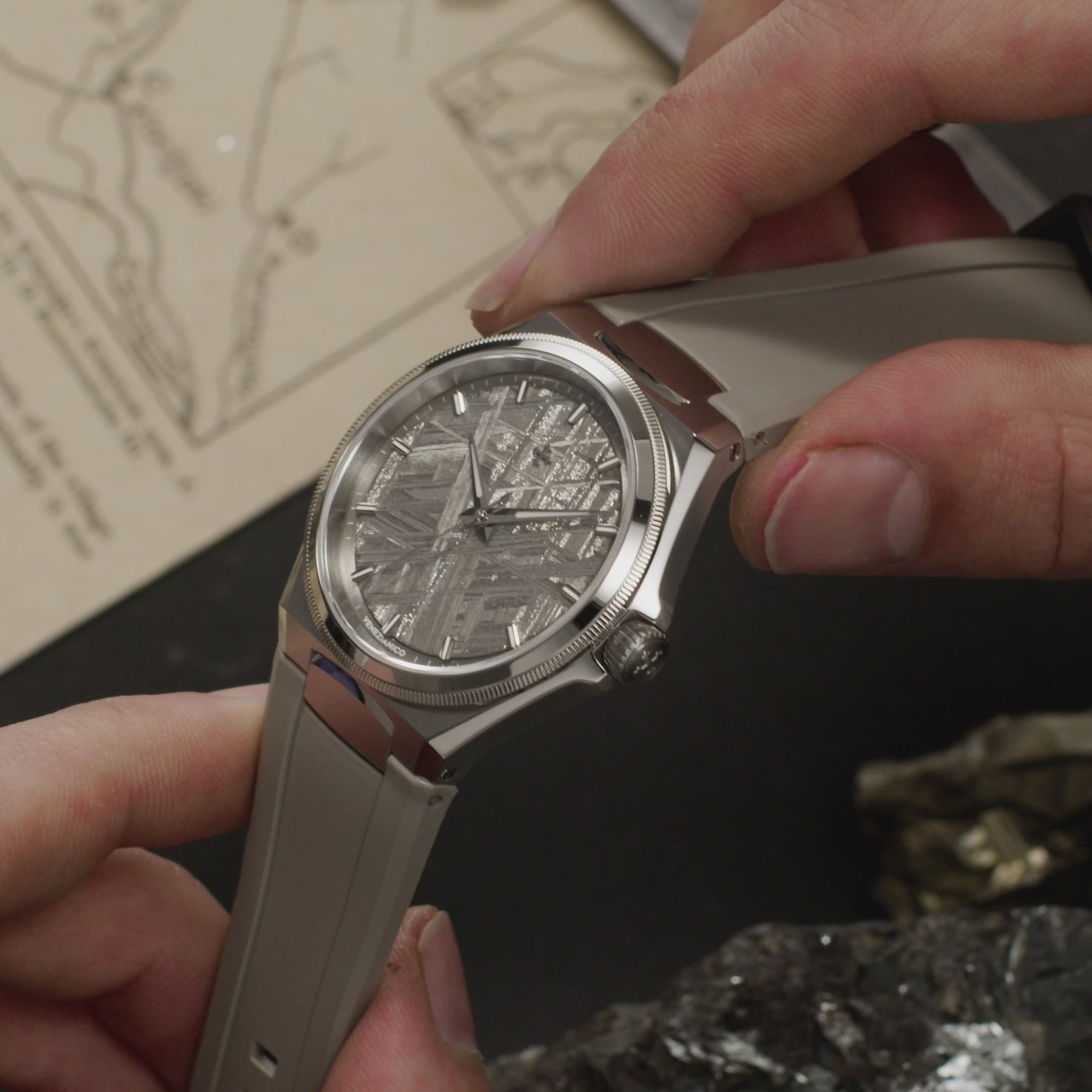 Arsenale Meteorite fonde l’energia primordiale di un materiale extraterrestre con un design essenziale e deciso. Il quadrante, realizzato in autentico meteorite, mostra una trama unica, formata da miliardi di anni di raffreddamento nello spazio profondo. La robusta cassa in acciaio satinato ne esalta il carattere audace, mentre il bracciale integrato completa l’orologio con un’estetica moderna e raffinata.