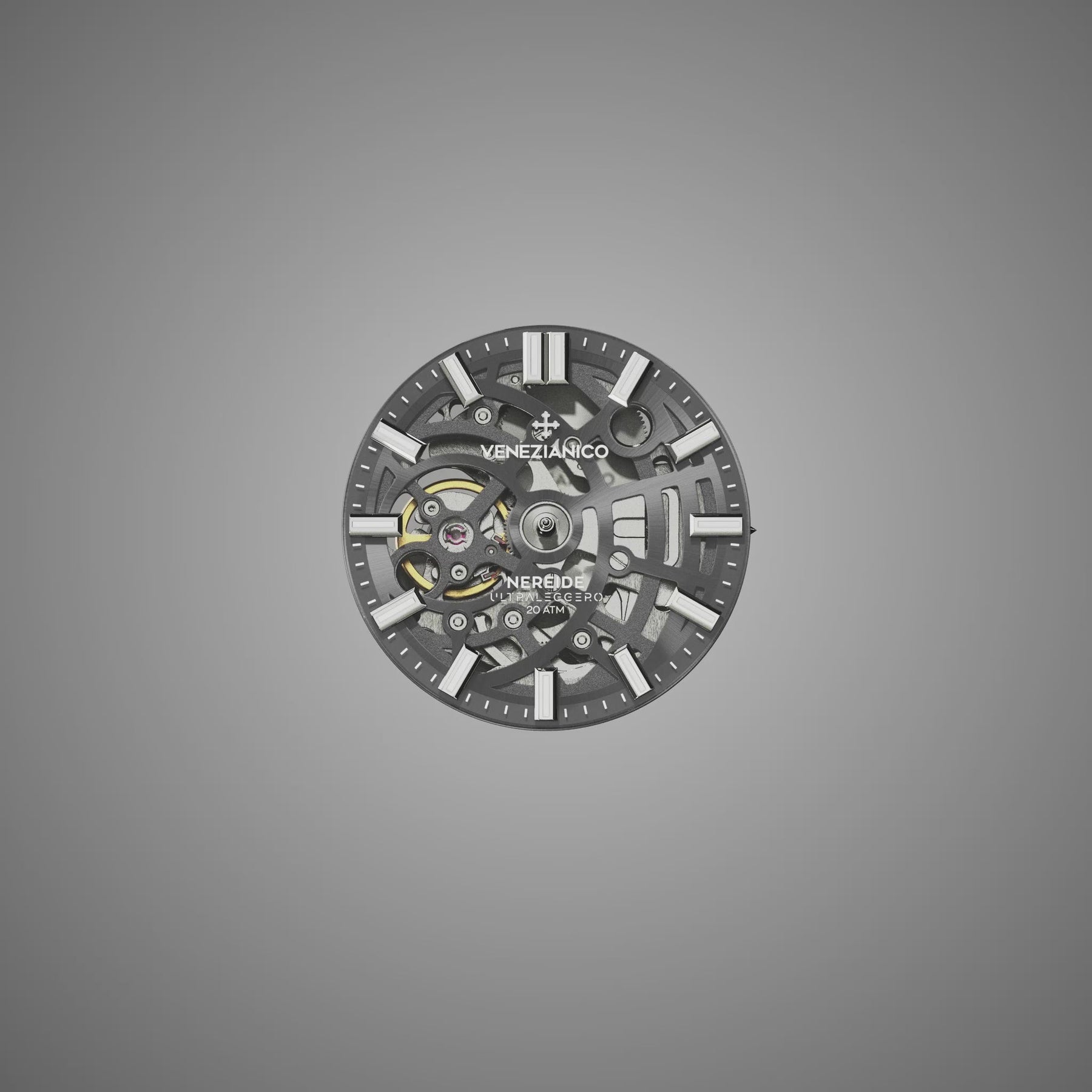 Ultraleggero è l’orologio più innovativo della serie Nereide e si ispira all’Uomo Vitruviano, simbolo del Rinascimento e della fine della contrapposizione tra arte e scienza. La singolare geometria del quadrante scheletrato si integra perfettamente con il corpo del movimento, attraverso un’originale soluzione costruttiva brevettata che consente maggior leggerezza e minore ingombro.