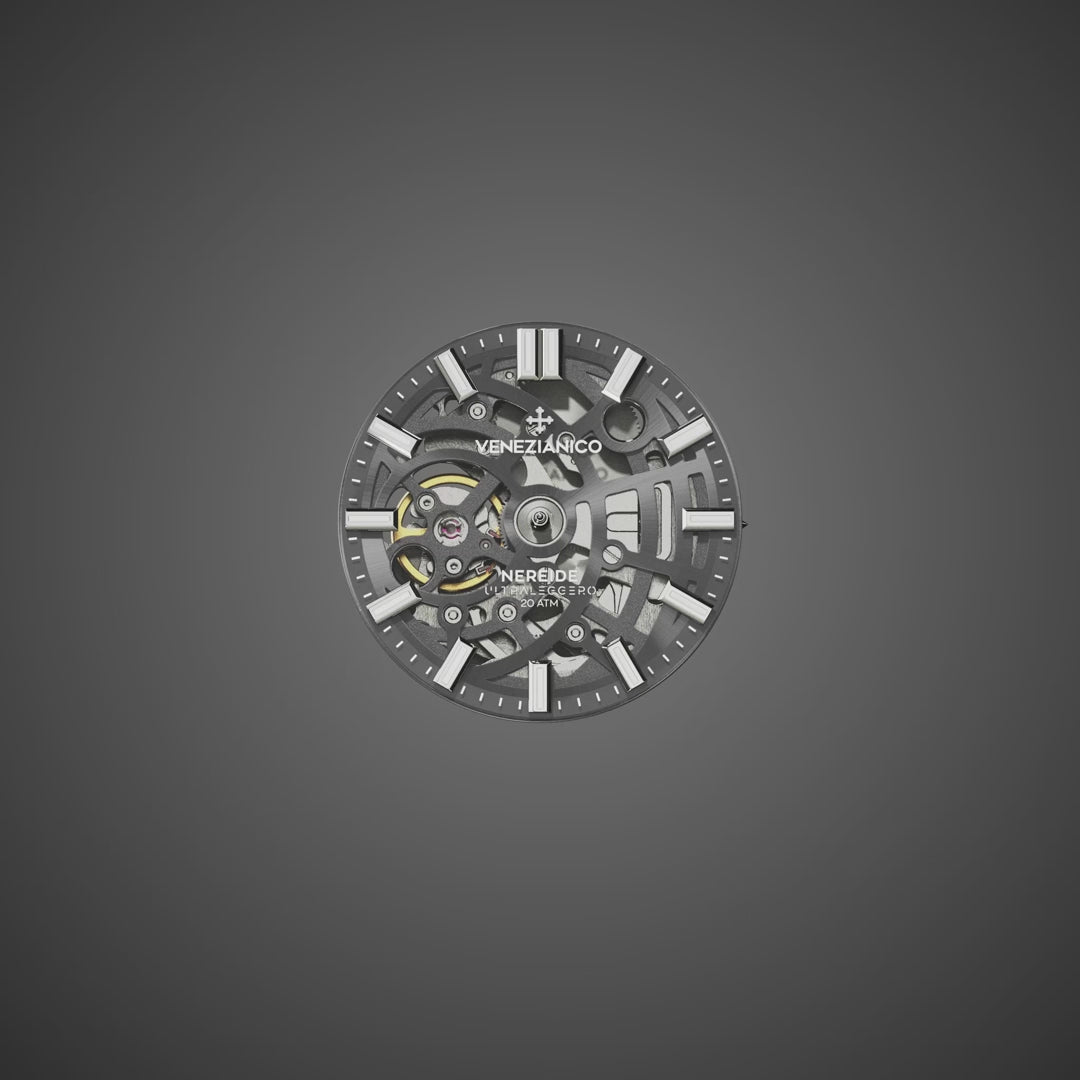 Ultraleggero è l’orologio più innovativo della serie Nereide e si ispira all’Uomo Vitruviano, simbolo del Rinascimento e della fine della contrapposizione tra arte e scienza. La singolare geometria del quadrante scheletrato si integra perfettamente con il corpo del movimento, attraverso un’originale soluzione costruttiva brevettata che consente maggior leggerezza e minore ingombro.