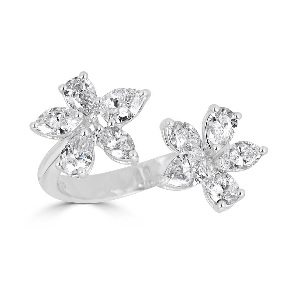 Questo splendido anello in oro 18 carati presenta 1,86 carati di scintillanti diamanti taglio marquise e a goccia disposti a formare due splendidi fiori. Questo anello è disponibile in oro bianco, giallo o rosa. Realizzato a mano in Italia da ZYDO Italian Jewelry. *Questo anello è realizzato su ordinazione. Si prega di attendere 4-6 settimane per la spedizione. Qualità del diamante: Colore F, Purezza VS Peso in carati del diamante: 1,86 Dimensioni: 1 pollice x 7/16 pollice.